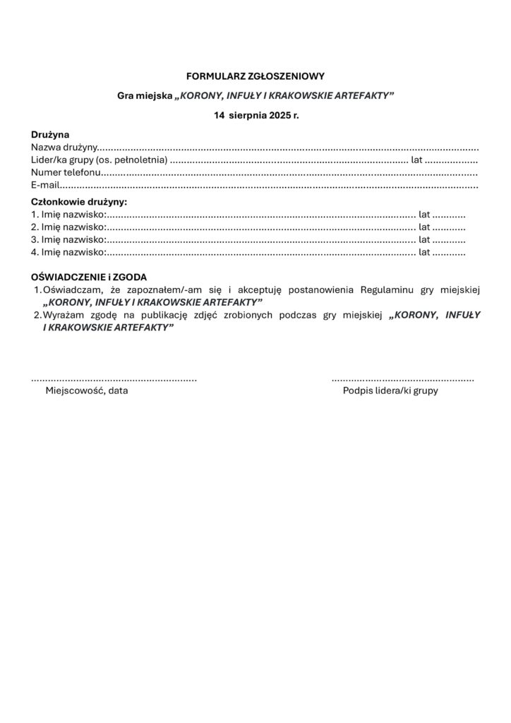 - Wyrażam zgodę na publikację zdjęć zrobionych podczas gry miejskiej „KORONY, INFUŁY I KRAKOWSKIE ARTEFAKTY”
