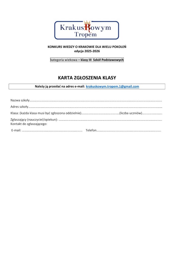 - Zgłoszenie klasy do konkursu w terminie do 15.10.2025 r. poprzez przesłanie karty zgłoszenia (załącznik 1) na adres mailowy krakuskowym.tropem.1@gmail.com. Każda klasa powinna być zgłoszona oddzielnie, wg podanego wzoru, wyłącznie przez nauczyciela. Proszę zwrócić uwagę na prawidłowy zapis kontaktowego adresu e-mailowego.