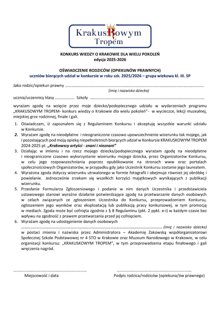 - Wyłonienie z każdej klasy laureata (jednego ucznia, który zdobył największą ilość punktów) i przesłanie na adres mailowy Organizatora: krakuskowym.tropem.1@gmail.com, wypełnionej karty zgłoszenia laureata do finału (wg dostarczonego wzoru), najpóźniej do 10.03.2026 r.