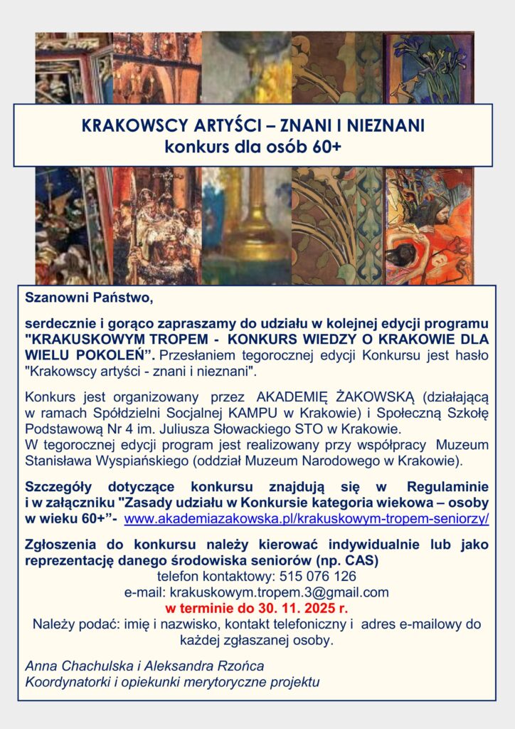 - 30.11.2025 r. – osoby w wieku 60+; zgłoszenia indywidualne lub reprezentacje CAS należy kierować na adres e-mail: krakuskowym.tropem.3@gmail.com lub telefonicznie: nr tel. 515 076 126 podając: imię i nazwisko, kontakt telefoniczny i adres e-mailowy